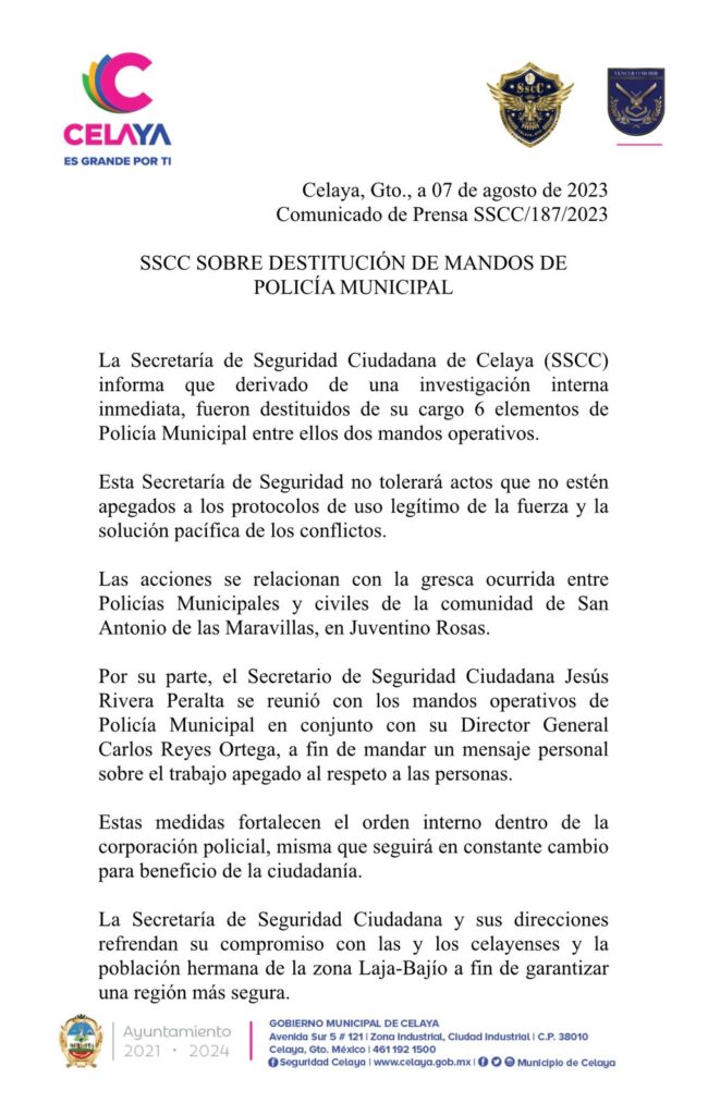 Home CelayaSecretaría de Seguridad Ciudadana informa sobre destitución de mandos policiales Celaya Secretaría de Seguridad Ciudadana informa sobre destitución de mandos policiales by Redacción 2 años ago by Redacción 2 años ago 0 minutes read Bookmark A+A- Reset Share 0FacebookTwitterWhatsappCopy LinkThreads 9 Celaya, Guanajuato previous post Vinculan a proceso a policía por presunta agresión sexual next post Cubrebocas en Guanajuato sólo es recomendación no obligación You may also like Bookmark Reforzarán recolección de basura con camiones reparados y nuevos 4 semanas ago Bookmark Reducirá JUMAPA cartera vencida en Celaya 4 semanas ago Bookmark Falta de policías ocasiona ausencia de casetas en colonias y barrios de... 4 semanas ago Leave a Comment Cancel Reply Save my name, email, and website in this browser for the next time I comment.