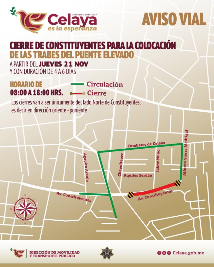 El operativo de Tránsito contará con entre seis y ocho elementos distribuidos estratégicamente, algunos fijos en puntos de desviación y otros flotantes para agilizar el tráfico en zonas críticas. Como vías alternas, se propone el uso de Alfonso Sierra Madrigal y Combates de Celaya, permitiendo la conexión hacia Lázaro Cárdenas o el retorno a Constituyentes por accesos cercanos. Se busca garantizar la movilidad y prevenir colapsos, especialmente en horas pico y en las inmediaciones de la Escuela Libertad, donde se reforzará la seguridad para estudiantes y peatones.