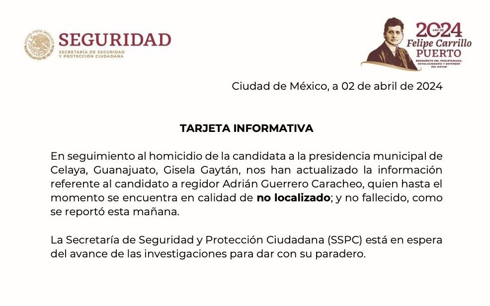 Sin embargo, tarde de este 2 de abril, la SSPC, informó que Guerrero Caracheo se encontraba en calidad de “no localizado”.