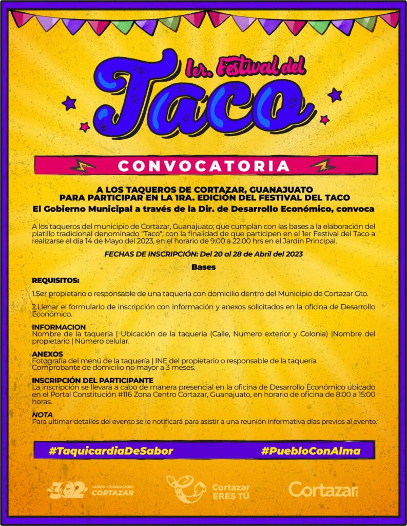 Por encomienda del Presidente Municipal Ariel Corona para seguir fortaleciendo la economía en el municipio, la dirección de Desarrollo Económico convoca a los taqueros de Cortazar para que participen en la primera edición del Festival del Taco.