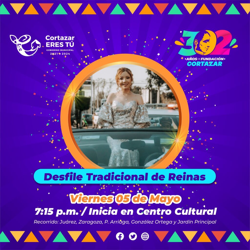 A las 8:00 de la noche se realizará la coronación de María Paula I como reina de la Fundación de Cortazar 302 aniversario, después a las 8:40 se presentará Nefi La Voz y cerrará la noche el cantante El Bebeto con su presentación artística a las 9:00 de la noche.