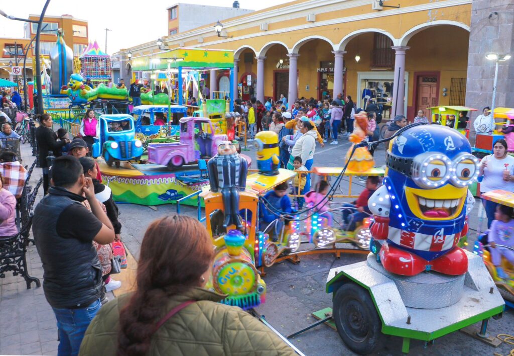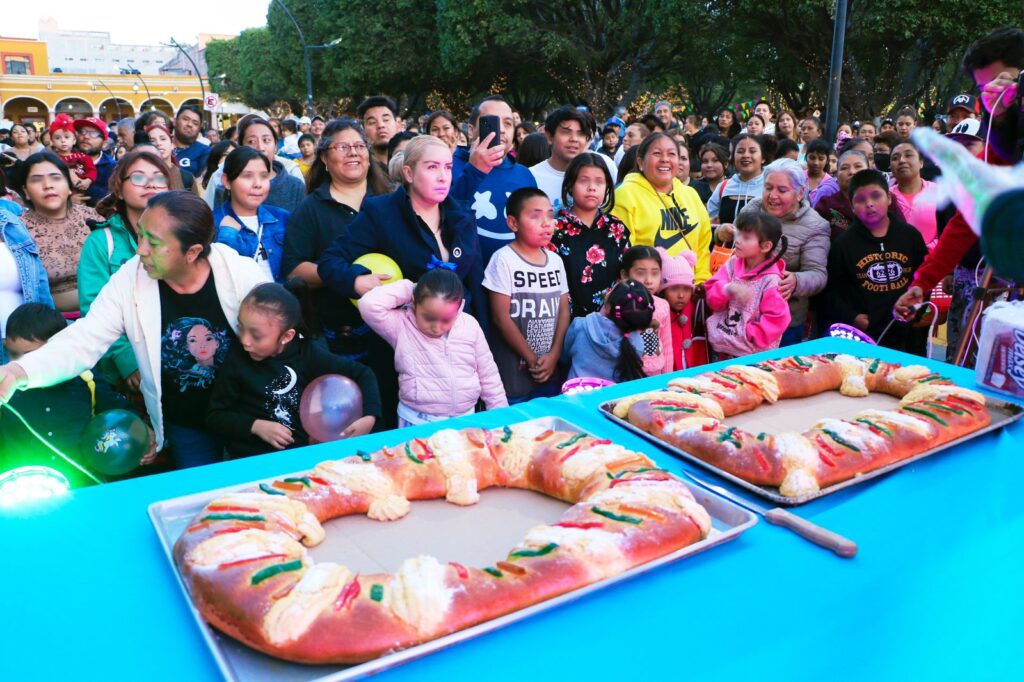 Momentos después, ante la algarabía de las familias que se congregaron en el Jardín Principal, autoridades municipales realizaron el corte tradicional de la Rosca de Reyes Monumental.