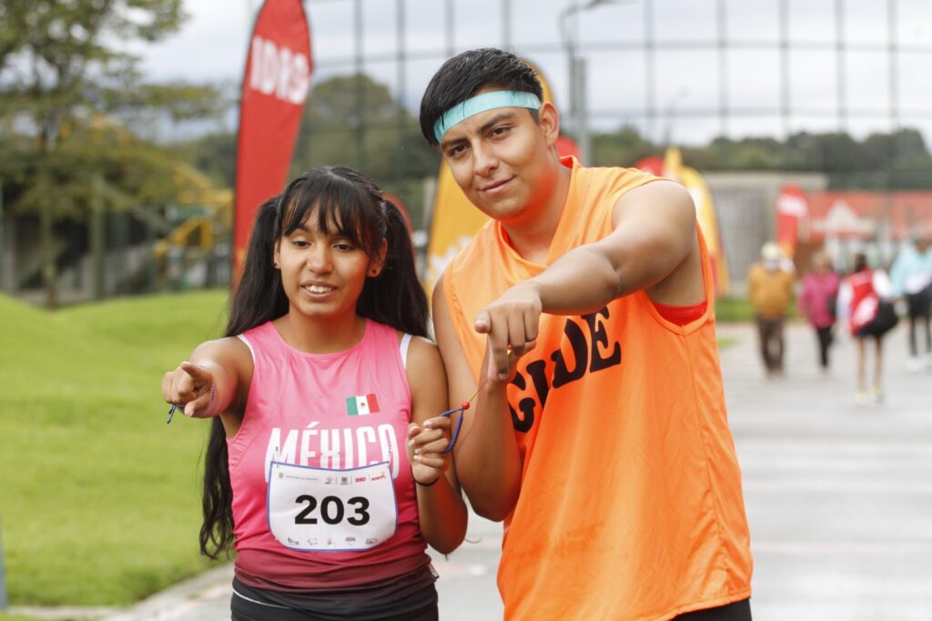 Amairany Rubio Pizano acompañada de su guía Emiliano Gómez Orozco, ganó la primera medalla para México en la prueba de 100 m planos categoría T11 sub 17, al cronometrar un tiempo de 14.25, desplazando al segundo sitio a su rival de Argentina Sofía Casse.4