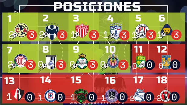 3ra posición: Necaxa con 3 unidades y dos goles a favor en los últimos minutos