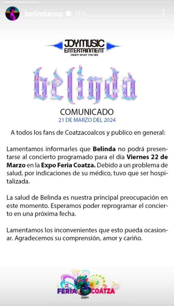Se espera que más adelante se compartan más detalles de las razones por las que Belinda se encuentra hospitalizada.