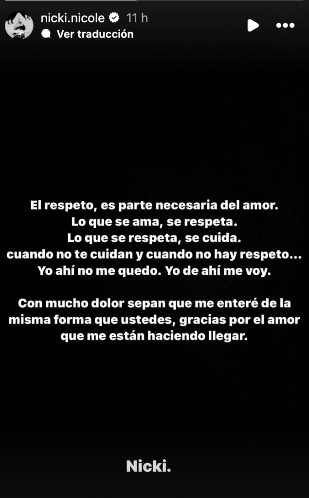 Finalmente, la cantante argentina ha dado un pequeño comunicado a través de una historia en cuenta de Instagram en donde habló sobre el respeto en la pareja y que al igual que los usuarios ella también se enteró de la infidelidad del cantante, por los videos que circularon en redes.