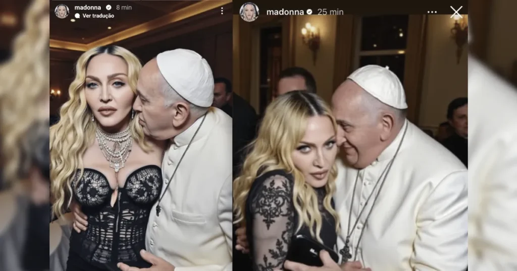 En una de las fotos, Madonna luce un elegante collar de perlas y un sofisticado vestido negro mientras el pontífice parece estar muy cerca de su rostro, con una mano en su cintura, dando la impresión de que la está oliendo.