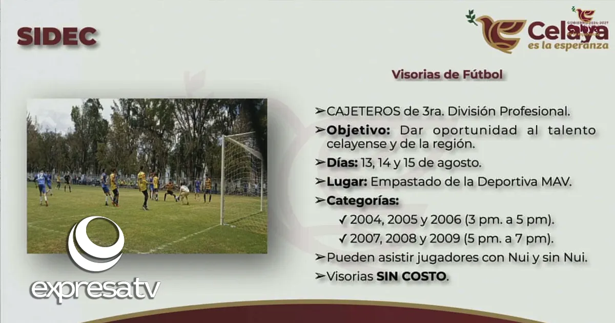 Como parte del proyecto, se realizarán visorias del 13 al 15 de agosto en el empastado de la Deportiva Miguel Alemán Valdés. Será para jugadores nacidos entre 2004 y 2009, con inscripción gratuita y participación abierta a futbolistas con o sin NUI.