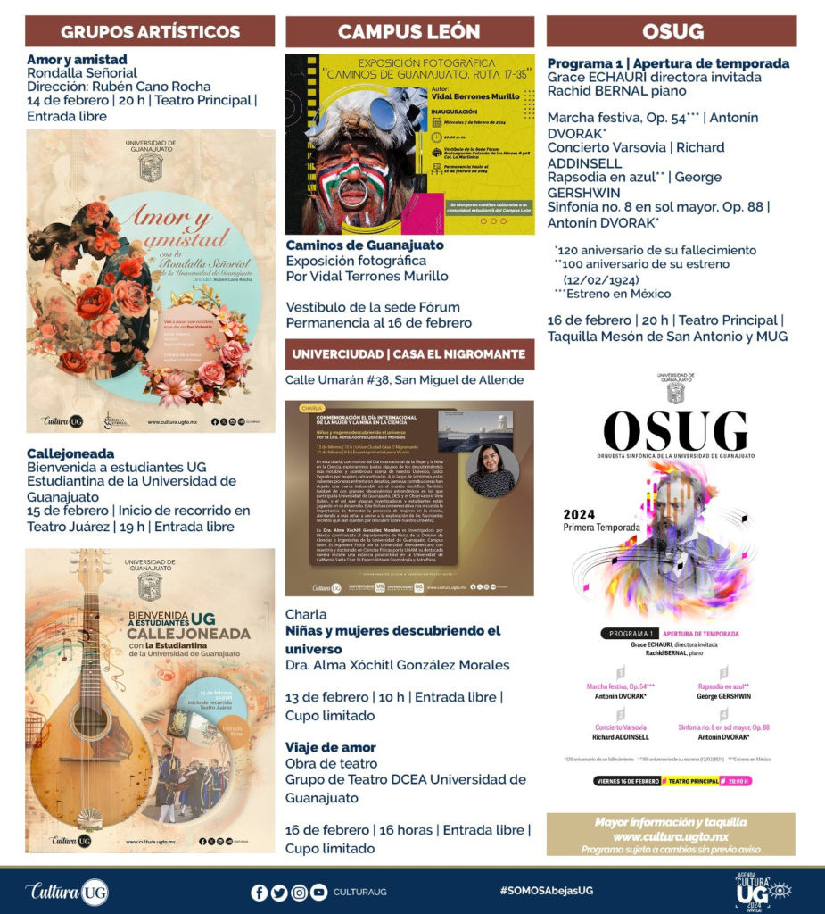 Para el 13 de febrero en Univerciudad, Casa El Nigromante en San Migue de Allende, se llevará a cabo la charla “Niñas y mujeres descubriendo el universo” por la Dra. Alma Xóchitl González Morales, en punto de las 10:00 horas con entrada libre; en este mismo foro, pero el 16 de febrero a las 16:00 horas, se presentará la obra de teatro “Viaje de amor” por parte del grupo de Teatro DCEA de la Universidad de Guanajuato.