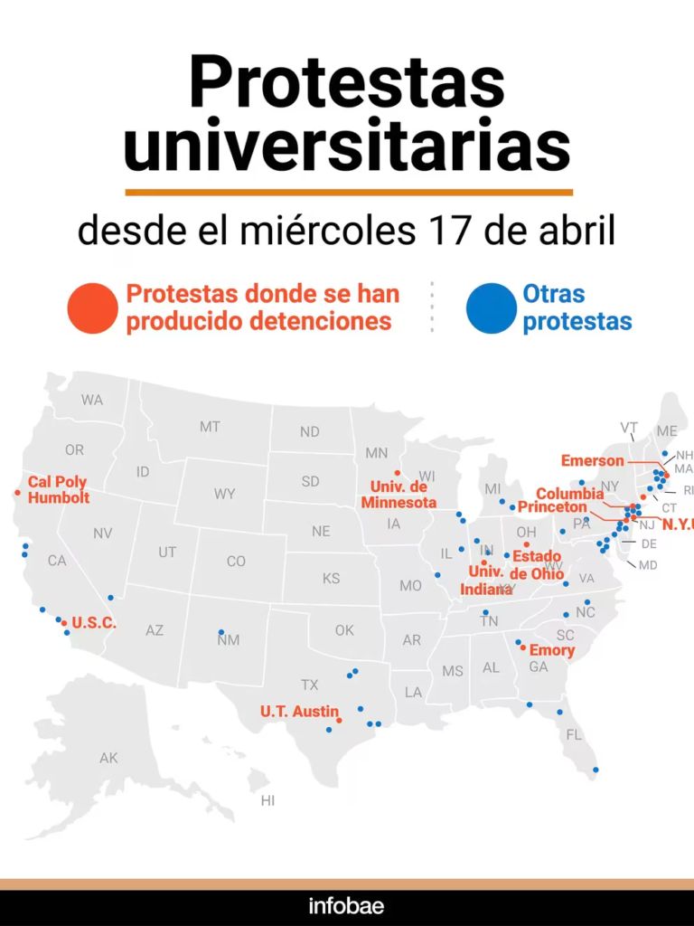 La protesta de Columbia es una de docenas en todo el país, incluso en campus de Texas, California, Georgia, Carolina del Norte, Utah, Virginia, Nuevo México, California, Nueva Jersey, Connecticut y Luisiana, donde la policía arrestó a más de 1.000 manifestantes.