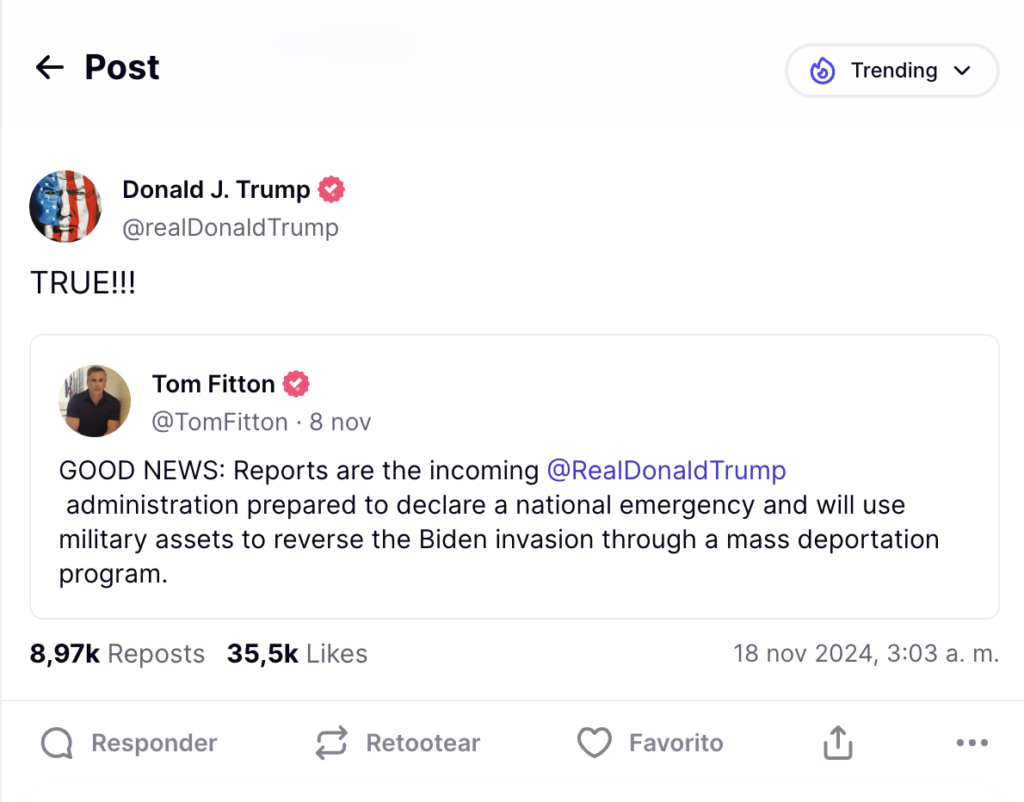 A través de la red social Truth Social, propiedad de Trump; Tom Fitton, activista conservador, divulgó que el próximo presidente está listo para realizar esta estrategia al inicio de su mandato en 2025.