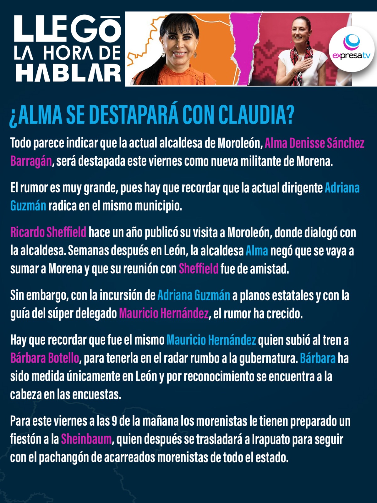 Home Llegó la Hora de Hablar¿ALMA DENISSE SÁNCHEZ SE DESTAPARÁ CON CLAUDIA SHEINBAUM? Llegó la Hora de Hablar ¿ALMA DENISSE SÁNCHEZ SE DESTAPARÁ CON CLAUDIA SHEINBAUM? by Redacción 3 años ago by Redacción 3 años ago 0 minutes read Bookmark A+A- Reset Share 0FacebookTwitterWhatsappCopy LinkThreads 9 previous post Clausuran diputados Segundo Periodo Ordinario de Sesiones next post Cade grupo de seguridad debe realizar acciones de su competencia You may also like Bookmark Celaya lo consiguió en un año 4 semanas ago Bookmark Se queda sin alcaldes Alejandra 1 mes ago Bookmark Conclave con Jorge Romero en León 1 mes ago Leave a Comment Cancel Reply Save my name, email, and website in this browser for the next time I comment.