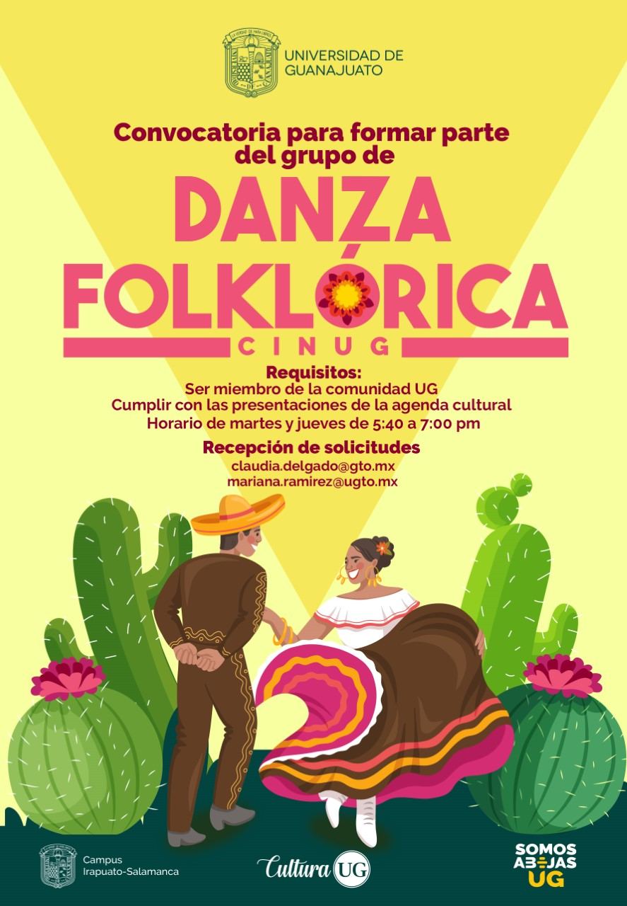 Finalmente, el Campus Irapuato – Salamanca, llama a formar parte del Grupo de Danza Folklórica CINUG. La recepción de solicitudes será a través del correo claudia.delgado@ugto.mx y mariana.ramirez@ugto.mx , mientras que una sesión informativa tendrá lugar el cuatro de mayo a las 17:40 horas en la cancha de usos múltiples del Centro Interdisciplinario del Noreste de la Universidad de Guanajuato (CINUG)