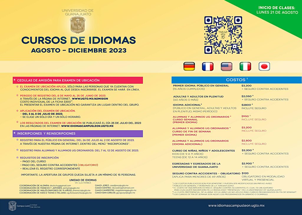 Finalmente se informa que el Campus León abre los cursos de idiomas del periodo agosto-diciembre 2023, en modalidad virtual y presencial. Mayores informes: www.idiomascampusleon.ugto.mx.