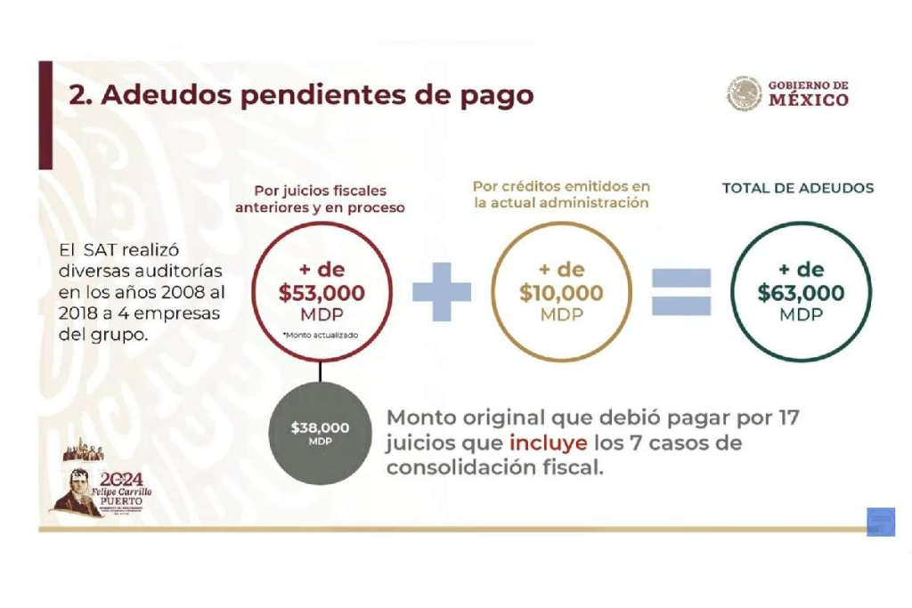 Grupo Salinas debe 53 mil millones por juicios fiscales y 10 mil millones por créditos emitidos durante el sexenio. El titular del SAT detalló también que solamente se han pagado 4 mil millones de pesos.
