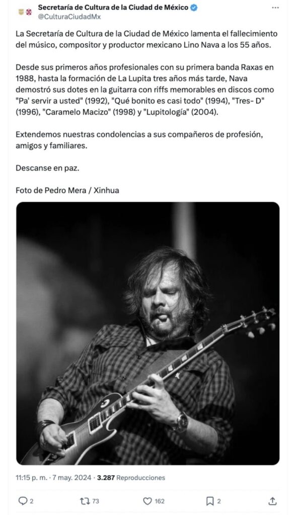La industria de la música se encuentra de luto, ya que se reportó la muerte de Lino Nava, icónico guitarrista mexicano de la banda de Rock La Lupita.