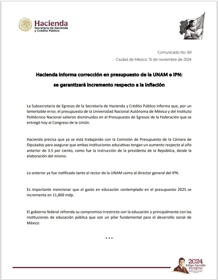 A través de un comunicado la Subsecretaría de Egresos informó sobre el “lamentable error” ante el presupuesto para la educación superior en el paquete económico 2025.