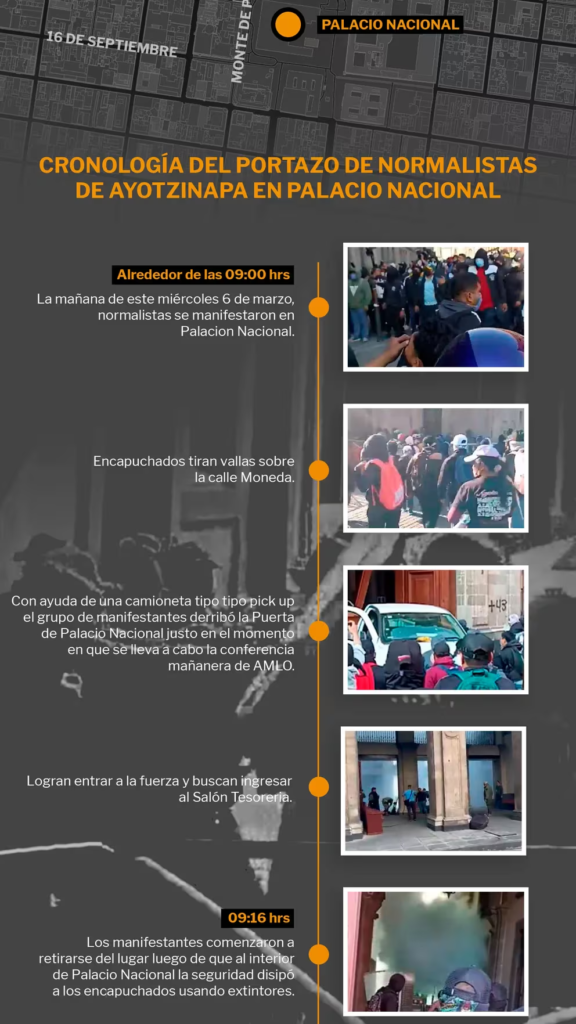 Durante la conferencia mañanera de este 6 de marzo, un grupo de supuestos normalistas de Ayotzinapa derribaron la Puerta del Palacio Nacional.