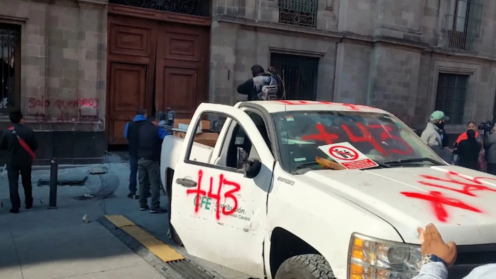 Los manifestantes también han utilizado una furgoneta de la Comisión Federal de Electricidad (CFE) que se encontraba aparcada en la calle como ariete para echar el portón abajo.