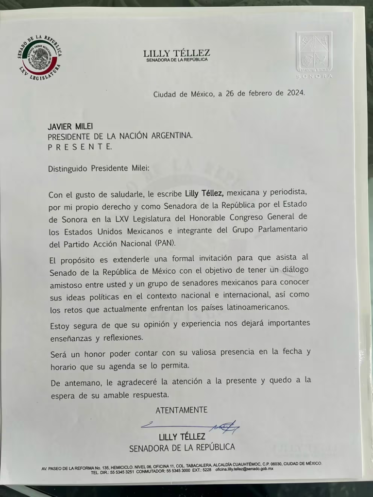 La Senadora por el PAN, Lilly Téllez, invitó al presidente de Argentina Javier Milei, para conocer las ideas políticas del senado mexicano.