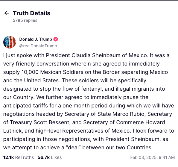 Indicó que el diálogo se llevó con respeto entre ambos mandatarios y acordaron que la imposición de aranceles del 25% para México, se “suspendería“ durante un mes. También señaló que se llegó a un acuerdo para que ambas naciones trabajen en conjunto.