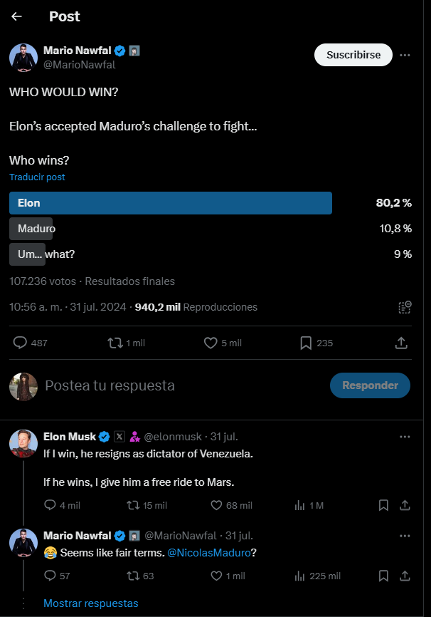 Luego de que Nicolás Maduro retará al empresario Elon Musk a una pelea, el millonario aceptó el desafío a través de una publicación en X.